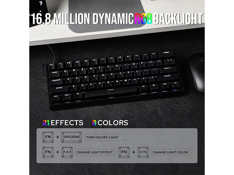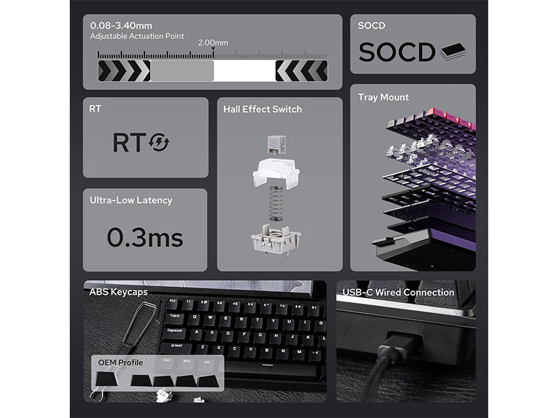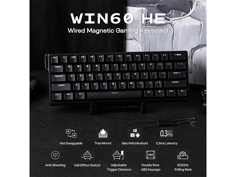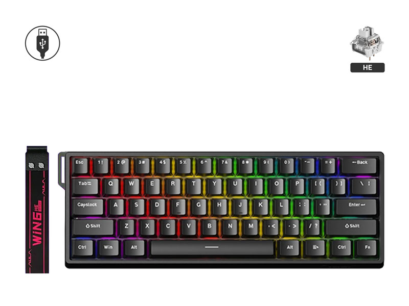این کیبورد دارای سوئیچ های مغناطیسی هال افکت به رنگ Grey Wood با صدای بسیار کم و بدون تماس فلزی و با دوام زیاد و سرعت پاسخگویی بالایی می باشد. این کیبورد مجهز به نورپردازی RGB با 16.8 میلیون رنگ می باشد که دارای 21 افکت نوری پیش فرض قابل تنظیم است. کیبورد Aula win60 HE دارای نرخ نمونه برداری 8000Hz بوده که حدود 8 برابر سریع تر از کیبوردهای معمولی با نرخ نمونه برداری 1000Hz است. این محصول نیازی به تعویض سوئیچ نداشته چرا که دکمه های آن عمر طولانی در مقایسه با کیبوردهایی با سوئیچ معمولی دارد. این کیبورد از تنظیم قابلیت فعالسازی (Actuation Point)، از 0.02mm تا 3.3mm با دقت 0.1mm برخوردار بوده و دارای 68 کلید با چیدمان 60 درصد، صرفه جویی در فضا و حفظ دسته عددی و جهت را دارا می باشد. متریال استفاده شده در ساخت بدنه کیبورد گیمینگ آئولا مدل WIN60 HE پلاستیک ABS می باشد و از طریق کابل جدا شونده USB-C به سیستم مورد نظر متصل می شود. تمامی کلیدهای این محصول بر اساس سبک بازی و تایپ قابل برنامه ریزی هستند و در برابر گرد و غبار و نفوذ مایعات مقاوم بوده و عملکرد پایداری را در شرایط مختلف دارند.