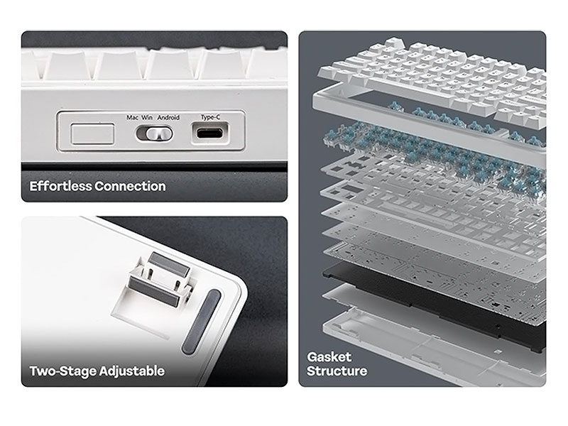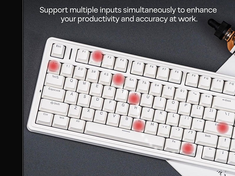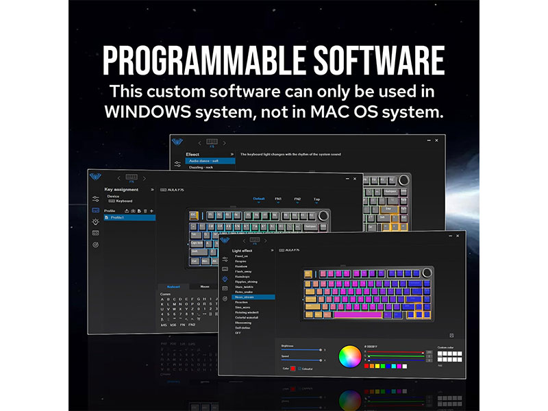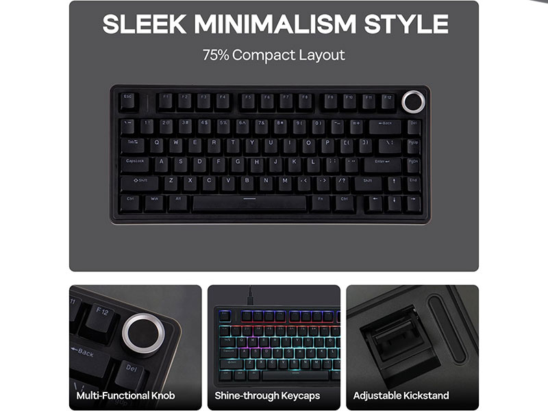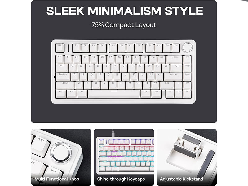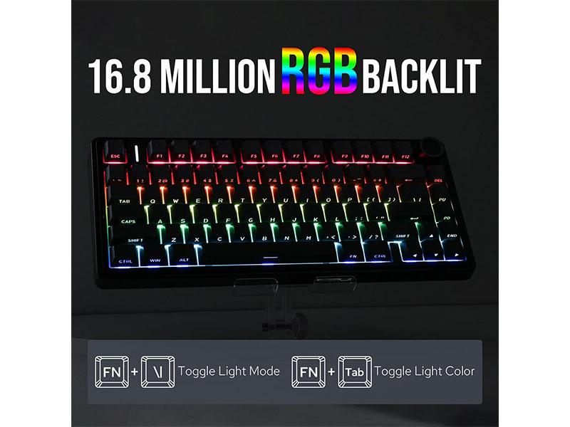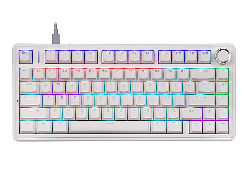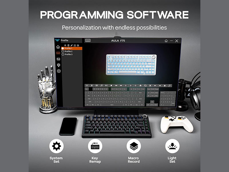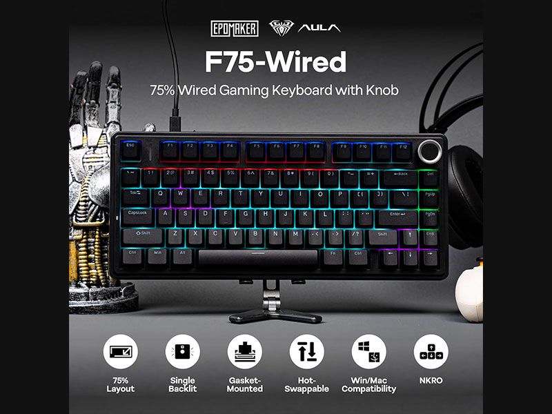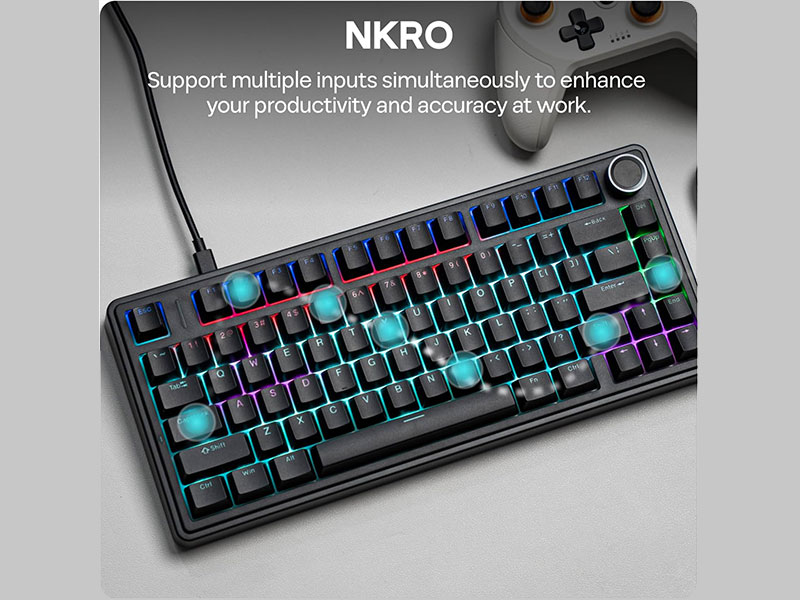 کیبورد AULA F75 دارای نورپردازی RGB با قابلیت تنظیم در چندین حالت و رنگ مختلف می باشد. کاربر از طریق این نورپردازی می تواند محیط بازی خود را بر اساس سلیقه شخصی خود تنظیم نموده و جلوهای جذاب به میز کار یا گیمینگ خود ببخشد. حالتهای گوناگون نورپردازی این کیبورد افکتهای پویا و استاتیک را شامل می شود که میتوانید از طریق نرمافزار آن را به دلخواه خود تنظیم کنید. این محصول از ویژگی Anti-Ghosting برای تمامی کلیدها برخوردار است که امکان فشار همزمان چندین دکمه را بدون تداخل فراهم میکند. این قابلیت برای بازیهای رقابتی که نیازمند دقت و سرعت بالا هستند، امری حیاتی است. همینطور وجود کلیدهای مالتی مدیا به کاربران این امکان را فراهم می سازد تا به راحتی موسیقی و ویدیوهای خود را کنترل کنند. کیبورد AULA F75 به وسیله کابل USB به دستگاههای مختلف وصل شده و با سیستمعاملهای ویندوز، مک و لینوکس سازگار می باشد. برای استفاده از این محصول نیازی به نصب درایور یا نرم افزار خاصی ندارید و به راحتی می توانید آن را به رایانه خود متصل نموده و اصتفاده کنید. این کیبورد برای گیمرهایی که به دنبال یک کیبورد مکانیکی با عملکرد سریع و نورپردازی جذاب هستند، می تواند گزینه ای بسیار مناسبی برای انتخاب باشد.