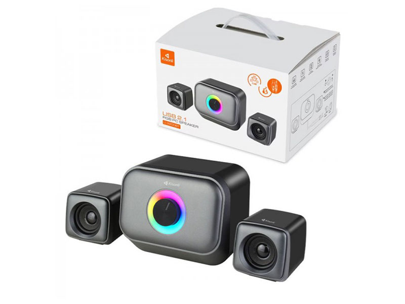 اسپیکر سه تکه بلوتوثی و باسیم کیسونلی مدل U-3200BT یک محصول مقرون به صرفه با صدای واضح و پرقدرت می باشد که برای انواع لپ تاپ، کامپیوتر و گوشی موبایل مناسب می باشد. جنس به کار رفته در ساخت این اسپیکر پلاستیک فشرده و باکیفیت می باشد که در قسمت جلویی ساب ووفر آن نورپردازی RGB در 7 رنگ متحرک وجود دارد که در محیط اتاق و روی میز کار زیبایی آن را دوچندان می کند. اسپیکر کیسونلی U-3200BT برای گیمرها و افرادی که تمایل به داشتن طراحی مدرن هستند کارایی عالی دارد. به سبب داشتن اندازه جمع و جور، این محصول روی میز کار فضای زیادی را اشغال نمی کند و دستگیر نمی باشد. این اسپیکر یک سیستم صوتی 2.1 کاناله می باشد که یک ساب ووفر به همراه دو عدد اسپیکر جانبی صدای بسیار خوبی را ارائه می دهد. اسپیکر بلوتوثی کیسونلی U-3200BT از توان خروجی کلی 5W+4W*2 بهره می برد که صدایی واضح و با بیس مناسبی دارد.